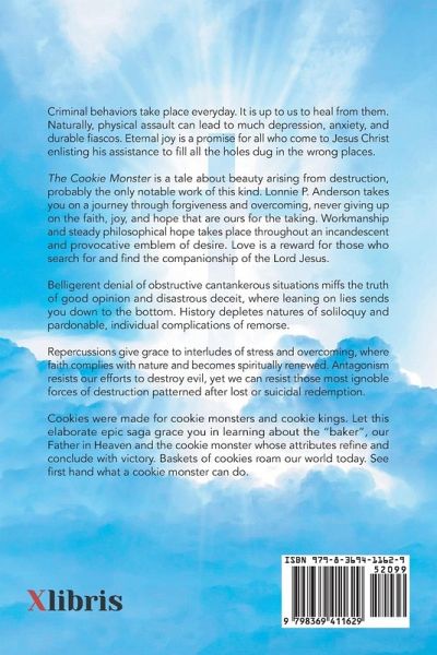 Criminal behaviors take place everyday. It is up to us to heal from them. Naturally, physical assault can lead to much depression, anxiety, and durable fiascos. Eternal joy is a promise for all who come to Jesus Christ enlisting his assistance to fill all the holes dug in the wrong places. The Cookie Monster is a tale about beauty arising from destruction, probably the only notable work of this kind. Lonnie P. Anderson takes you on a journey through forgiveness and overcoming, never giving up on the faith, joy, and hope that are ours for the taking. Workmanship and steady philosophical hope takes place throughout an incandescent and provocative emblem of desire. Love is a reward for those who search for and find the companionship of the Lord Jesus. Belligerent denial of obstructive cantankerous situations miffs the truth of good opinion and disastrous deceit, where leaning on lies sends you down to the bottom. History depletes natures of soliloquy and pardonable, individual complications of remorse. Repercussions give grace to interludes of stress and overcoming, where faith complies with nature and becomes spiritually renewed. Antagonism resists our efforts to destroy evil, yet we can resist those most ignoble forces of destruction patterned after lost or suicidal redemption. Cookies were made for cookie monsters and cookie kings. Let this elaborate epic saga grace you in learning about the "baker", our Father in Heaven and the cookie monster whose attributes refine and conclude with victory. Baskets of cookies roam our world today. See first hand what a cookie monster can do.