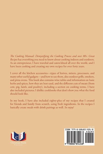 The Cooking Manual: Demystifying the Cooking Process and over 80+ Great Recipes has everything you need to know about cooking indoors and outdoors. As an entrepreneur, I have traveled and eaten/dined all over the world, and I have been cooking and creating my own recipes for over forty years. I cover all the kitchen accessories--types of knives, mixers, processors, and many other useful gadgets--and how to use them, also outdoor grills, smokers, and pizza ovens. This book also contains wine tables and information on basic herbs and spices, how they are best used, and the different cuts of meats (from cow, pig, lamb, and poultry), including a section on cooking terms. I have also included pictures; I dislike cookbooks that don't show you what the food should look like. In my book, I have also included eighty-plus of my recipes that I created for friends and family from scratch, using fresh ingredients. In the recipes I basically create meals with drink pairings as well. So enjoy!