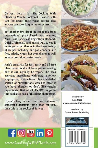 Oh yes... here it is... The Cooking With Plants 15 Minute Cookbook! Loaded with 100 'no-stress' tasty vegan recipes that anyone can cook in 15 minutes or less. Yet another jaw dropping cookbook from the international plant based meal mentor, Anja Cass (www.cookingwithplants.com). Quick... simple... and tasty! PLUS, you'll never get bored thanks to the huge variety or recipes including one pot wonders, stir frys, salads, wraps, hot oven dishes as well as easy prep slow cooker meals. Anja's creativity for fast, tasty and oil-free plant based food will leave you wondering how it can actually be vegan. She uses everyday ingredients with easy to follow step-by-step instructions plus a detailed selection of substitutions which is great of you have allergies or don't like certain ingredients. Best of all, EVERY recipe in this book also has a full colour photograph. If you're busy or short on time, but want something delicious that's good for you, then this is the cookbook for you!