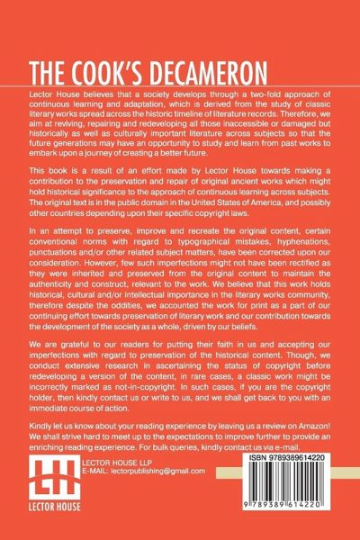The Cook's Decameron: A Study In Taste Containing Over Two Hundred Recipes For Italian Dishes This book is a result of an effort made by us towards making a contribution to the preservation and repair of original classic literature. In an attempt to preserve, improve and recreate the original content, we have worked towards: 1. Type-setting & Reformatting: The complete work has been re-designed via professional layout, formatting and type-setting tools to re-create the same edition with rich typography, graphics, high quality images, and table elements, giving our readers the feel of holding a 'fresh and newly' reprinted and/or revised edition, as opposed to other scanned & printed (Optical Character Recognition - OCR) reproductions. 2. Correction of imperfections: As the work was re-created from the scratch, therefore, it was vetted to rectify certain conventional norms with regard to typographical mistakes, hyphenations, punctuations, blurred images, missing content/pages, and/or other related subject matters, upon our consideration. Every attempt was made to rectify the imperfections related to omitted constructs in the original edition via other references. However, a few of such imperfections which could not be rectified due to intentional\unintentional omission of content in the original edition, were inherited and preserved from the original work to maintain the authenticity and construct, relevant to the work. We believe that this work holds historical, cultural and/or intellectual importance in the literary works community, therefore despite the oddities, we accounted the work for print as a part of our continuing effort towards preservation of literary work and our contribution towards the development of the society as a whole, driven by our beliefs. We are grateful to our readers for putting their faith in us and accepting our imperfections with regard to preservation of the historical content. HAPPY READING!
