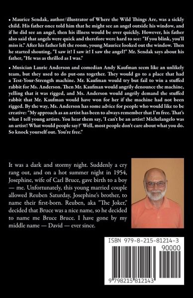 This is a short, quick, and easy read. Most of these anecdotes are probably just OK (comedy is hard!), but there should be at least one or two that you will want to tell your friends. ¿ Maurice Sendak, author/illustrator of Where the Wild Things Are, was a sickly child. His father once told him that he might see an angel outside his window, and if he did see an angel, then his illness would be over quickly. However, his father also said that angels were quick and therefore were hard to see: "If you blink, you'll miss it." After his father left the room, young Maurice looked out the window. Then he started shouting, "I saw it! I saw it! I saw the angel!" Mr. Sendak says about his father, "He was as thrilled as I was." ¿ Musician Laurie Anderson and comedian Andy Kaufman seem like an unlikely team, but they used to do put-ons together. They would go to a place that had a Test-Your-Strength machine. Mr. Kaufman would try but fail to win a stuffed rabbit for Ms. Anderson. Then Mr. Kaufman would angrily denounce the machine, yelling that it was rigged, and Ms. Anderson would angrily demand the stuffed rabbit that Mr. Kaufman would have won for her if the machine had not been rigged. By the way, Ms. Anderson has some advice for people who would like to be creative: "My approach as an artist has been to always remember that I'm free. That's what I tell young artists. You hear them say, 'I can't be an artist! Michelangelo was an artist! What would people say?' Well, most people don't care about what you do. So knock yourself out. You're free." ¿ When the marriage of Emerald, the younger sister of African-American artist Ashley Bryan, ended, she had five children to provide for. Her parents took her and her family in, and Ashley helped her out financially. Some of his salary as an art teacher and his income as an artist went to raise her children until they were grown. The children helped him out by posing for him, although since they were young, occasionally he had trouble getting them to stand still for the pose: "Come back! Come back! Come back to the pose!" In his life, Mr. Bryan has tried to do what the members of his church told him when they gave him a room and art supplies so he could teach art to children: "You have a talent. Share your gifts with others." By the way, children sometimes ask him if he is rich. He replies, "Am I rich? Oh, I am SO rich! I have the blue sky overhead, the green grass underfoot, the clouds, the trees, the flowers!" African-American author Walter Dean Myers learned from Mr. Bryan, "It's about the art." ¿ Before World War II, Lucy Carrington Wertheimer ran an art gallery that championed the work of modern artists; however, earlier in her life, she knew little about the work of modern artists. In her home, she owned and hung paintings by such artists as Zoffaney, Géricault, and Sickert. Her younger sister, Fanny Wadsworth, who was married to a cousin of modern artist Edward Wadsworth, looked at her collection, then asked, "Lucy, have you never heard of Picasso?"