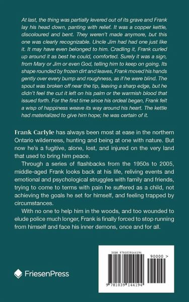 At last, the thing was partially levered out of its grave and Frank lay his head down, panting with relief. It was a copper kettle, discoloured and bent. They weren't made anymore, but this one was clearly recognizable. Uncle Jim had had one just like it. It may have even belonged to him. Cradling it, Frank curled up around it as best he could, comforted. Surely it was a sign, from Mary or Jim or even God, telling him to keep on going. Its shape rounded by frozen dirt and leaves, Frank moved his hands gently over every bump and roughness, as if he were blind. The spout was broken off near the tip, leaving a sharp edge, but he didn't feel the cut it left on his palm or the warmish blood that issued forth. For the first time since his ordeal began, Frank felt a wisp of happiness weave its way around his heart. The kettle had materialized to give him hope; he was certain of it. Frank Carlyle has always been most at ease in the northern Ontario wilderness, hunting and being at one with nature. But now he's a fugitive, alone, lost, and injured on the very land that used to bring him peace. Through a series of flashbacks from the 1950s to 2005, middle-aged Frank looks back at his life, reliving events and emotional and psychological struggles with family and friends, trying to come to terms with pain he suffered as a child, not achieving the goals he set for himself, and feeling trapped by circumstances. With no one to help him in the woods, and too wounded to elude police much longer, Frank is finally forced to stop running from himself and face his inner demons, once and for all.