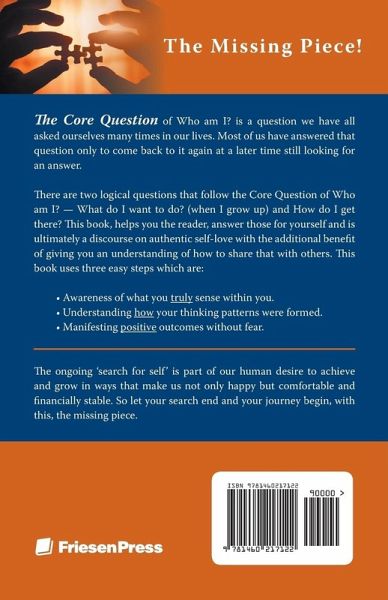 The Core Question of Who am I? is a question we have all asked ourselves many times in our lives. Most of us have answered that question only to come back to it again at a later time still looking for an answer. There are two logical questions that follow the Core Question of Who am I? - What do I want to do? (when I grow up) and How do I get there? This book, helps you the reader, answer those for yourself and is ultimately a discourse on authentic self-love with the additional benefit of giving you an understanding of how to share that with others. This book uses three easy steps which are: ¿ Awareness of what you truly sense within you. ¿ Understanding how your thinking patterns were formed. ¿ Manifesting positive outcomes without fear. The ongoing 'search for self' is part of our human desire to achieve and grow in ways that make us not only happy but comfortable and financially stable. So let your search end and your journey begin, with this, the missing piece.