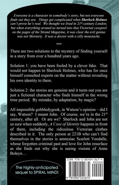 Everyone is a character in somebody's story, but not everyone finds out they are. Things get complicated when Sherlock Holmes can't prove he's real. We thought we lived in 21st-century London, but when everything around us turned into that Victorian cesspool on the pages of the Strand Magazine, it was clear the evil genius was not Moriarty. It was a doctor with a silly moustache. There are two solutions to the mystery of finding yourself in a story from over a hundred years ago. Solution 1: you have been fooled by a clever fake. That would not happen to Sherlock Holmes, who has for once himself consulted experts on the matter without revealing his own identity to them. Solution 2: the stories are genuine and it turns out you are just a fictional character who finds himself in the wrong time period. By mistake, by adaptation, by magic? All impossible gobbledygook, in Watson's opinion - did I say, Watson? I meant John. Of course, we're in the 21st century, after all. Or are we? Sherlock and John are not so sure when suddenly, A Case of Identity happens in front of them, including the ridiculous Victorian clothes described in it. The only person at 221B who can't find themselves in the stories is amnesiac Scarlett Vendalle, whose forgotten criminal past and love for John resurface as she finds out why she is seeing visions of Anne Boleyn...