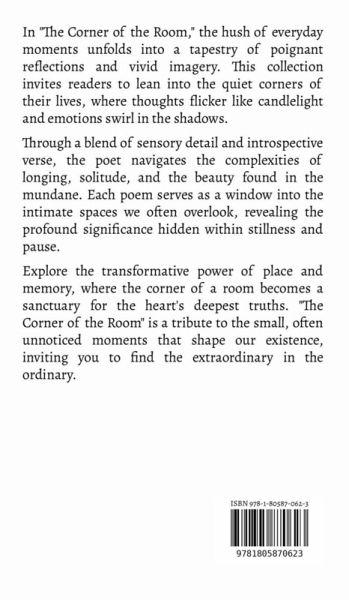 In "The Corner of the Room," the hush of everyday moments unfolds into a tapestry of poignant reflections and vivid imagery. This collection invites readers to lean into the quiet corners of their lives, where thoughts flicker like candlelight and emotions swirl in the shadows. Through a blend of sensory detail and introspective verse, the poet navigates the complexities of longing, solitude, and the beauty found in the mundane. Each poem serves as a window into the intimate spaces we often overlook, revealing the profound significance hidden within stillness and pause. Explore the transformative power of place and memory, where the corner of a room becomes a sanctuary for the heart's deepest truths. "The Corner of the Room" is a tribute to the small, often unnoticed moments that shape our existence, inviting you to find the extraordinary in the ordinary.