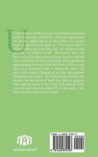 Urban fiction is on the rise and sweeping the interest of people from every walk of life. There are many novels out on this subject but never have there ever been a book as real and as in depth as, "The Corner Store". When reading this book One may ask themselves the question, "Is it ficton at all". The Corner Store will have you on the edge of your seat as you dive into the lives and the minds of several young, wild and reckless gang banging characters from this book. All those who have ever wondered what is behind the game will enjoy discovering it through an up close and personal behind the scenes look. The Corner Store will take you diectly into the minds of hard core, fearless gangstas who walk the streets of New York. Get ready for what you will soon discover about life in the hood. A life only a few have lived to tell about.