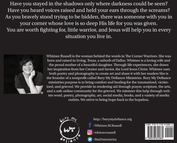 Whitnee Russell was born and raised in Irving, Texas, a suburb of Dallas. Whitnee is a loving wife and the proud mother of a beautiful daughter. Through life experiences, she draws her inspiration from her Creator and Savior, the Lord Jesus Christ. Whitnee uses both poetry and photography to create art and share it with her readers She is the founder of a nonprofit called Bury My Defiance Ministries. Bury My Defiance ministries purpose is to bring comfort and healing for the traumatized, victimized, and grieved. We provide in rendering aid through prayer, scripture, the arts, and a safe online community for the grieved. We minister this help through written word, poetry, photography, art, social media, books, and a variety of media outlets. We strive to bring hope back to the hopeless.