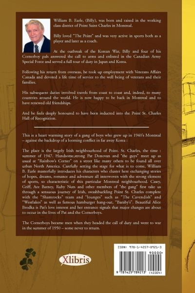 This is a heart warming story of a gang of boys who grew up in 1940's Montreal - against the backdrop of a looming confl ict in far away Korea : The place is the largely Irish neighbourhood of Point. St. Charles, the time : summer of 1947. Handsome,strong Pat Donovan and "the guys" meet up as usual at "Rainbow's Corner" on a street like many others to be found all over urban North America. Carefully setting the stage for what is to come, William B. Earle masterfully introduces his characters who cluster here exchanging stories of hopes, dreams, romance and adventure all interwoven with the strong element of sports, so characteristic of this particular Montreal neighbourhood. Casey, Griff, Ace Barney, Ruby Nuts and other members of "the gang" first take us through a sensuous journey of Irish, swashbuckling Point St. Charles complete with the "Shamrocks" team and "lounges" such as "The Cavendish" and "Westlakes" as well as famous hamburger hang-out, "Baraby's" Beautiful Alice Brodka is Pat's love interest and her entrance signals that major changes are about to occur in the lives of Pat and the Cornerboys. The Cornerboys became men when they headed the call of duty and went to war in the summer of 1950 - some never to return.