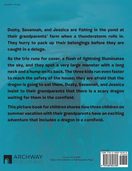 Dusty, Savannah, and Jessica are fishing in the pond at their grandparents' farm when a thunderstorm rolls in. They hurry to pack up their belongings before they are caught in a deluge. As the trio runs for cover, a flash of lightning illuminates the sky, and they spot a very large monster with a long neck and a hump on its back. The three kids run even faster to reach the safety of the house; they are afraid that the dragon is going to eat them. Dusty, Savannah, and Jessica insist to their grandparents that there is a scary dragon waiting for them in the cornfield. This picture book for children shares how three children on summer vacation with their grandparents have an exciting adventure that includes a dragon in a cornfield.