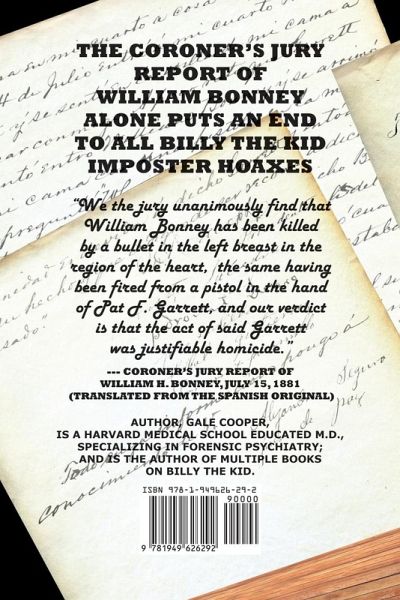 "Gale Cooper's The Coroner's Jury Report of Billy the Kid: The Inquest that Sealed the Fame of Billy Bonney and Pat Garrett, proves that it takes just that one Report to end all the Billy the Kid imposter hoaxes. This is the definitive book on that Report, which identified Pat Garrett's July 14, 1881 Fort Sumner victim as William Bonney, "the Kid." Given are the circumstances of that Coroner's Jury Report's writing, its proper filing with San Miguel County court records, and its basis for Pat Garrett's collecting his reward. The book also debunks the 20th century Billy the Kid imposter hoaxes of "Brushy Bill" Roberts and John Miller, which were based on denying that Garrett fatally shot the Kid on July 14, 1881, claimed he killed an innocent victim instead, and lied that Billy survived to old age as themselves. Also hoaxbusted are the 21st century "Billy the Kid Case" hoax and the "Cold Case Billy the Kid" megahoax, built on those old imposters' lies, with more added. The author is a Billy the Kid expert, author of many history and hoaxbusting books on the subject. She is a Harvard Medical School educated M.D. forensic psychiatrist"--