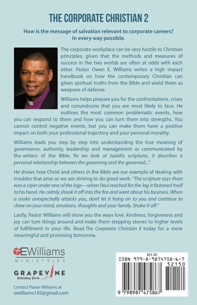 A continuation of Pastor Owen Williams first book "The Corporate Christian: Christian Beliefs Vs. Corporate Behaviors" This book "The Corporate Christian 2: Battle for Your Beliefs" deals with those personal battles that will be fought to maintain your beliefs so, righteous and ethical behavior is consistent in daily living. Pastor Williams highlights and identifies those behaviors and emotions which provoke us and draw out our old natures which tend to gravitate to outburst, anger and resentment. The scope of this book is laid out on a ten-chapter journey traveling to the soul of man where they can be strengthen in their faith and beliefs and in their faithfulness to their behavior. This is not an anti-corporate book, but does identify real circumstances, issues and attacks that find futile ground in this environment, and how believers can be victorious in maintaining their beliefs using biblical concepts.