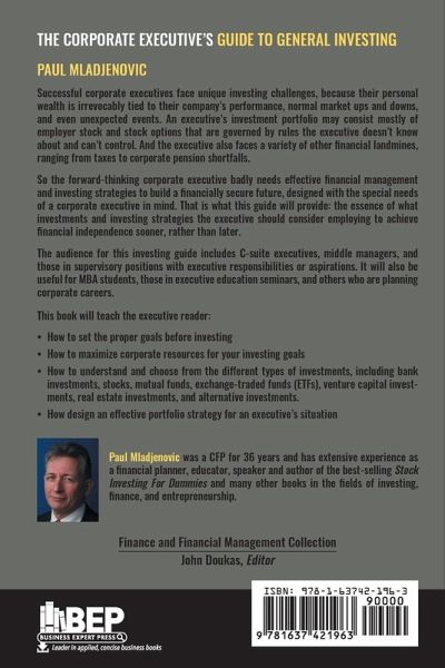 Successful corporate executives face unique investing challenges, because their personal wealth is irrevocably tied to their company's performance, normal market ups and downs, and even unexpected events. An executive's investment portfolio may consist mostly of employer stock and stock options that are governed by rules the executive doesn't know about and can't control. And the executive also faces a variety of other financial landmines, ranging from taxes to corporate pension shortfalls. So the forward-thinking corporate executive badly needs effective financial management and investing strategies to build a financially secure future, designed with the special needs of a corporate executive in mind. That is what this guide will provide: the essence of what investments and investing strategies the executive should consider employing to achieve financial independence sooner, rather than later. The audience for this investing guide includes C-suite executives, middle managers, and those in supervisory positions with executive responsibilities or aspirations. It will also be useful for MBA students, those in executive education seminars, and others who are planning corporate careers. This book will teach the executive reader: How to set the proper goals before investing How to maximize corporate resources for your investing goals How to understand and choose from the different types of investments, including bank investments, stocks, mutual funds, exchange-traded funds (ETFs), venture capital investments, real estate investments, and alternative investments. How design an effective portfolio strategy for an executive's situation