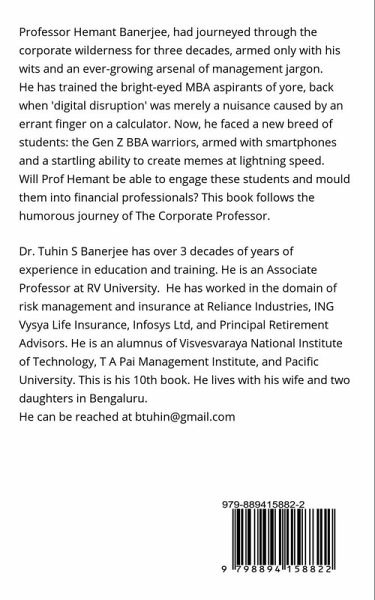 In the hallowed halls of academia, where knowledge reigns supreme and PowerPoint slides flicker like modern-day cave paintings, there stood a professor whose experience was as vast as his tie collection. Professor Hemant Banerjee, had journeyed through the corporate wilderness for three decades, armed only with his wits and an ever-growing arsenal of management jargon. He has trained the bright-eyed MBA aspirants of yore, back when 'digital disruption' was merely a nuisance caused by an errant finger on a calculator. Now, he faced a new breed of students: the Gen Z BBA warriors, armed with smartphones and a startling ability to create memes at lightning speed. Will Prof Hemant be able to engage the students and mould them into financial professionals? This book follows the humorous journey of The Corporate Professor.