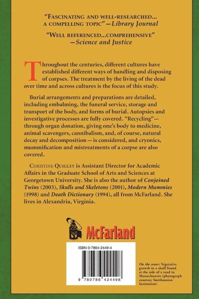 Throughout the centuries, different cultures have established a variety of procedures for handling and disposing of corpses. Often the methods are directly associated with the deceased's position in life, such as a pharaoh's mummification in Egypt or the cremation of a Buddhist. Treatment by the living of the dead over time and across cultures is the focus of this study. Burial arrangements and preparations are detailed, including embalming, the funeral service, storage and transport of the body, and forms of burial. Autopsies and the investigative process of causes of deliberate death are fully covered. Preservation techniques such as cryonic suspension and mummification are discussed, as well as a look at the ""recycling"" of the corpse through organ donation, donation to medicine, animal scavengers, cannibalism, and, of course, natural decay and decomposition. Mistreatments of a corpse are also covered.