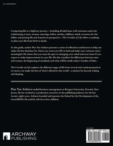 Comparing life to a highway journey-including divided lanes with entrances and exits culminating at man, woman, marriage, father, mother, children, mind, reverence for the dollar, and putting life and America in perspective-The Corridor of Life offers a roadmap to plan your life from birth to death. In this guide, author Pius Yao Ashiara presents a series of reflections and lessons to help you make the best decisions for where you want your life to lead and make your existence more meaningful. He shows that you must be open to changing your mind and your heart if you expect to make improvements in your life. He also considers the differences between men and women, the beginning of mankind, and what will be inside today's Garden of Eden. The Corridor of Life explores the different stages of life from several and varied perspectives to ensure you make the best of what's offered in this world-a mission far beyond waking and sleeping.