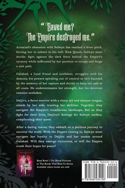 "Saved me? The Empire destroyed me." Artaxiad's obsession with Sulwyn has reached a fever pitch, forcing her to submit to his will. Now Queen, Sulwyn must decide: fight against the dark force behind the Empire's tyranny while suffocated by her position or escape and forge a new path. Galahad, a loyal friend and confidant, struggles with his demons, his powers spiraling out of control as he's haunted by the memory of her capture and driven to keep her safe at all costs. He underestimates her strength, but his devotion remains unshaken. Daijiro, a fierce warrior with a sharp wit and sharper tongue, stands by her side, trusting her abilities. Together, they navigate the Empire's treacherous landscape. But as they fight for their lives, Daijiro's feelings for Sulwyn surface, complicating their quest. After a daring rescue, they embark on a perilous journey to uncover the truth. With the Empire closing in, Sulwyn must navigate her loyalty to Daijiro and her unease around Galahad. Will they emerge victorious, or will the Empire crush their hopes for peace?