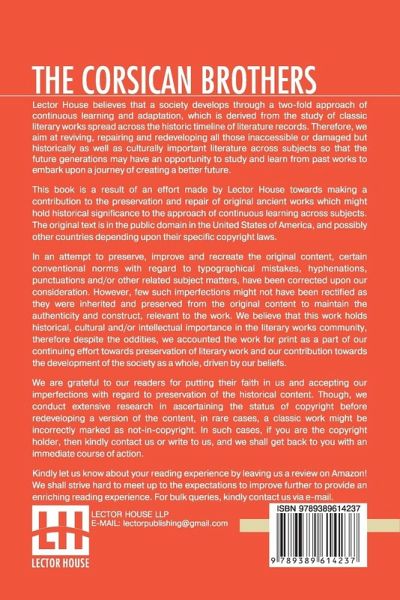The Corsican Brothers: A Novel Translated By Henry Frith This book is a result of an effort made by us towards making a contribution to the preservation and repair of original classic literature. In an attempt to preserve, improve and recreate the original content, we have worked towards: 1. Type-setting & Reformatting: The complete work has been re-designed via professional layout, formatting and type-setting tools to re-create the same edition with rich typography, graphics, high quality images, and table elements, giving our readers the feel of holding a 'fresh and newly' reprinted and/or revised edition, as opposed to other scanned & printed (Optical Character Recognition - OCR) reproductions. 2. Correction of imperfections: As the work was re-created from the scratch, therefore, it was vetted to rectify certain conventional norms with regard to typographical mistakes, hyphenations, punctuations, blurred images, missing content/pages, and/or other related subject matters, upon our consideration. Every attempt was made to rectify the imperfections related to omitted constructs in the original edition via other references. However, a few of such imperfections which could not be rectified due to intentional\unintentional omission of content in the original edition, were inherited and preserved from the original work to maintain the authenticity and construct, relevant to the work. We believe that this work holds historical, cultural and/or intellectual importance in the literary works community, therefore despite the oddities, we accounted the work for print as a part of our continuing effort towards preservation of literary work and our contribution towards the development of the society as a whole, driven by our beliefs. We are grateful to our readers for putting their faith in us and accepting our imperfections with regard to preservation of the historical content. HAPPY READING!