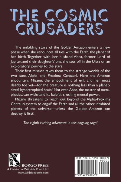 The unfolding story of the Golden Amazon enters a new phase when she renounces all ties with the Earth, the planet of her birth. Together with her husband Abna, former Lord of Jupiter, and their daughter Viona, she sets off in the Ultra on an exploratory journey to the stars. Their first mission takes them to the strange worlds of the two suns, Alpha and Proxima Centauri. Here the Amazon encounters Mizanu, the embodiment of evil, and her most deadly foe yet--for the creature is nothing less than a planet-sized, hypertrophied brain! Not even Abna, the master of metaphysics, can withstand its baleful, crushing mental power. Mizanu threatens to reach out beyond the Alpha-Proxima Centauri system to engulf the Earth and all the other inhabited planets of the universe--unless the Golden Amazon can destroy it first! The eighth exciting adventure in this ongoing saga!