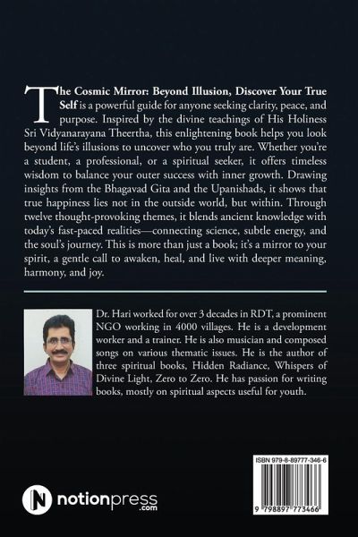 The Cosmic Mirror: Beyond Illusion, Discover Your True Self is a powerful guide for anyone seeking clarity, peace, and purpose. Inspired by the divine teachings of His Holiness Sri Vidyanarayana Theertha, this enlightening book helps you look beyond life's illusions to uncover who you truly are. Whether you're a student, a professional, or a spiritual seeker, it offers timeless wisdom to balance your outer success with inner growth. Drawing insights from the Bhagavad Gita and the Upanishads, it shows that true happiness lies not in the outside world, but within. Through twelve thought-provoking themes, it blends ancient knowledge with today's fast-paced realities-connecting science, subtle energy, and the soul's journey. This is more than just a book; it's a mirror to your spirit, a gentle call to awaken, heal, and live with deeper meaning, harmony, and joy.