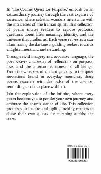 In "The Cosmic Quest for Purpose," embark on an extraordinary journey through the vast expanse of existence, where celestial wonders intertwine with the intricacies of the human spirit. This collection of poems invites readers to explore profound questions about life's meaning, identity, and the universe that cradles us. Each verse serves as a star illuminating the darkness, guiding seekers towards enlightenment and understanding. Through vivid imagery and evocative language, the poet weaves a tapestry of reflections on purpose, love, and the interconnectedness of all beings. From the whispers of distant galaxies to the quiet revelations found in everyday moments, these poems resonate with the pulse of the cosmos, reminding us of our place within it. Join the exploration of the infinite, where every poem beckons you to ponder your own journey and embrace the cosmic dance of life. This collection promises to inspire and uplift, inviting readers to chase their own quests for meaning amidst the stars.