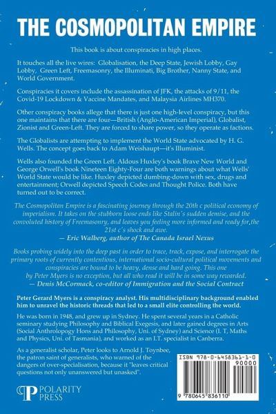 This book is about conspiracies in high places. It shows that Democracies are in fact Oligarchies run by a conspiratorial elite comprising four factions-Imperial (Anglo-American), Globalist, Zionist and Green Left. It touches all the live wires: Globalization, the Deep State, Jewish Lobby, Gay Lobby, Green Left, Freemasonry, the Illuminati, Big Brother, Nanny State, and World Government. The Imperial faction is the secret society founded by Cecil Rhodes and led by Lord Alfred Milner. It aimed to create an imperial Anglosphere by getting the United States to rejoin the Empire, even if the capital had to be transferred to the USA. The UKUSA secret treaty and the Five Eyes intelligence network are the work of this faction. But Anglo-American unity only come about through the Balfour Declaration, by which the USA entered World War I-via the machinations of the Jewish Lobby (even though other Jews opposed Zionism). The Zionists became a faction of the elite then; they aim at World Rule from Jerusalem. The Trotskyist left follow Noam Chomsky's line that Israel is merely the sheriff of the West in the Middle East, but realists admit that the Lobby largely controls Congress and gets the USA to fight Israel's wars. The Gaza War and Genocide have put the power of the Lobby in the spotlight. The Globalist faction was spawned by the Boer War. They rejected Imperialism and aimed for a World State; they sought that goal at the Peace Conference of Versailles, and again after World War II, and also after the Cold War. George Soros, the Rothschilds, the New York Times and the Economist belong in this faction. The Green Left are the Left faction of the Globalists. Both factions promote Open Borders, Net Zero, Hate Speech Laws, LGBT, Vaccine Mandates, and International Courts; they differ over Palestine, the War on Terror, nuclear power, and public ownership of industries. Bill Clinton (Globalist) signed the U.S. up to join the International Criminal Court in 2000; but George W. Bush (Imperial) "unsigned" the treaty, refusing to ratify it. In 2003 the Socialist International, in its Declaration of São Paulo, called for "global governance" and a "new global tax" levied by the U.N. to provide global public services including environmental protection. It also called for Tax Havens to be abolished, and cancellation of the debt of poor countries. The Globalists are attempting to implement the World State advocated by H. G. Wells, a supporter of Lenin and Trotsky but opponent of Stalin. The World State would end war, permanently, but may be tyrannical. The motto of the Globalists is "One World or None," meaning that, without World Government, we will destroy ourselves-by wars, pandemics, or environmental degradation. As an intermediate step, the Globalists are promoting the merging of Nation States into Region States. The European Union is the first, and a North American Union is also planned. That would be the end of the U.S. Constitution; the U.S. Dollar would be replaced by the Amero. The Globalists don't mind if the Dollar collapses under unrepayable debt, because they have a replacement, and the U.S. Constitution is an impediment to their plans. H. G. Wells was the founder of the Green Left. Aldous Huxley's book Brave New World and George Orwell's book Nineteen Eighty-Four are both warnings about what Wells' World State would be like. Huxley depicted dumbing-down with sex, drugs and entertainment; Orwell depicted Speech Codes and Thought Police. Both have turned out to be correct. The Cosmopolitan Empire includes original, detailed analysis of a number of conspiracies: * The Media Blackout on the Assassination of JFK * The Balfour Declaration as a Secret Treaty * MH370 Solved: The CIA and the Broken-Wing Display * The Mossad and CIA roles in 9/11, and * Evidence That Stalin Was Murdered.