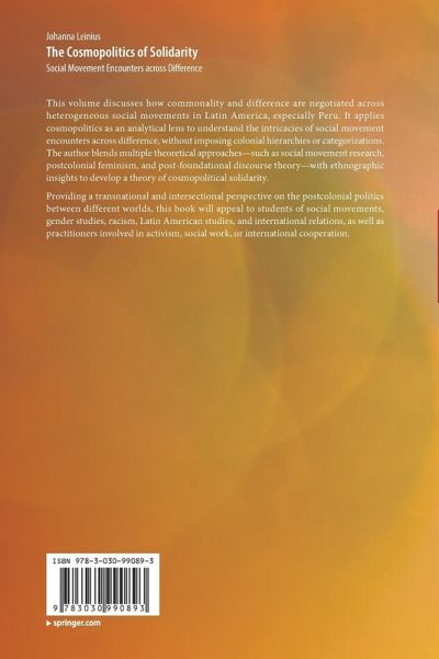 This volume discusses how commonality and difference are negotiated across heterogeneous social movements in Latin America, especially Peru. It applies cosmopolitics as an analytical lens to understand the intricacies of social movement encounters across difference, without imposing colonial hierarchies or categorizations. The author blends multiple theoretical approaches-such as social movement research, postcolonial feminism, and post-foundational discourse theory-with ethnographic insights to develop a theory of cosmopolitical solidarity.