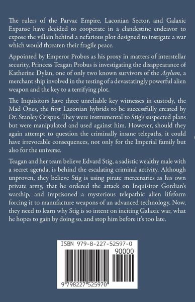 The rulers of the Parvac Empire, Laconian Sector, and Galaxic Expanse have decided to cooperate in a clandestine endeavor to expose the villain behind a nefarious plot designed to instigate a war which would threaten their fragile peace. Appointed by Emperor Probus as his proxy in matters of interstellar security, Princess Teagan Probus is investigating the disappearance of Katherine Dylan, one of only two known survivors of the Asylum, a merchant ship involved in the testing of a devastatingly powerful alien weapon and the key to a terrifying plot. The Inquisitors have three unreliable key witnesses in custody, the Mad Ones, the first Laconian hybrids to be successfully created by Dr. Stanley Crispus. They were instrumental to Stig's suspected plans but were manipulated and used against him. However, should they again attempt to question the criminally insane telepaths, it could have irrevocable consequences, not only for the Imperial family but also for the universe. Teagan and her team believe Edvard Stig, a sadistic wealthy male with a secret agenda, is behind the escalating criminal activity. Although unproven, they believe Stig is using pirate mercenaries as his own private army, that he ordered the attack on Inquisitor Gordian's warship, and imprisoned a mysterious telepathic alien lifeform forcing it to manufacture weapons of an advanced technology. Now, they need to learn why Stig is so intent on inciting Galaxic war, what he hopes to gain by doing so, and stop him before it's too late.