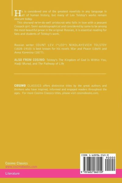 He is considered one of the greatest novelists in any language in all of human history, but many of Leo Tolstoy's works remain obscure today. This short novel, first published in 1862, gives us Dmitiri Olenin: reluctant soldier and ne'er-do-well aristocrat who falls in love with a peasant Cossack girl. Semi-autobiographical and considered by some to be among the most beautiful prose in the original Russian, it is essential reading for fans and students of Tolstoy's work. Russian writer COUNT LEV ("LEO") NIKOLAYEVICH TOLSTOY (1828-1910) is best known for his novels War and Peace (1869) and Anna Karenina (1877). ALSO FROM COSIMO: Tolstoy's The Kingdom of God Is Within You, Hadji Murad, and The Pathway of Life