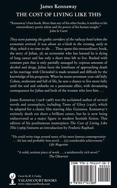 "Kennaway's best book. More than any of his other books, it testifies to his extraordinary poetic talent and the power of his human insight." - John le Carré "If there is any justice at all . . . Kennaway's stock will rise posthumously. He could, after all, write rings around many of his more famous contemporaries. And is it too much to hope that he will be remembered at least partly as the author of The Cost of Living Like This, his last and probably best novel?" - Life Magazine "A moving and serious book, the harrowing theme is heightened by Kennaway's extraordinary ability to convince us that what he is saying appears not only real but true." - Spectator "A solid, sentient piece of work . . . a satisfactorily rich novel." - The Observer They were painting the gothic corridors of the railway hotel when the economist arrived. It was about six o'clock in the evening, early in May, which is no time to die . . . Thus opens this extraordinary book, the story of Julian, 37, an economist who has learned he is dying of lung cancer and has only a short time left to live. Racked with constant pain that is only partially assuaged by copious amounts of alcohol and drugs, Julian faces the loneliness of approaching death as his marriage with Christabel is made strained and difficult by the knowledge of his illness. When he meets seventeen-year-old Sally Cohen, exuberant and full of life, he sees a chance to live more fully until the end and embarks on a passionate affair, with devastating consequences for Julian and both of the women who love him . . . James Kennaway (1928-1968) was the acclaimed author of several novels and screenplays, including Tunes of Glory (1956), which he adapted for a classic film starring Alec Guinness. Kennaway's untimely death cut short a brilliant career, but he is now being rediscovered as a major figure in modern Scottish fiction. This edition of his posthumous masterpiece The Cost of Living Like This (1969) features an introduction by Frederic Raphael.