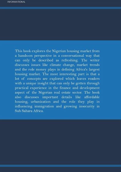 This book explores the Nigerian housing market from a hands-on perspective in a conversational way that can only be described as refreshing. The writer discusses issues like climate change, market trends and the role money plays in defining Africa's largest housing market. The most interesting part is that a lot of concepts are explored which leaves readers with a unique insight that can only be gotten through practical experience in the finance and development aspect of the Nigerian real estate sector. The book also discusses important details like affordable housing, urbanization and the role there play in influencing immigration and growing insecurity in sub-Sahara Africa.