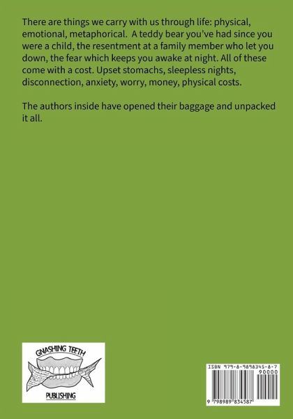 There are things we carry with us through life: physical, emotional, metaphorical. A teddy bear you've had since you were a child, the resentment at a family member who let you down, the fear which keeps you awake at night. All of these come with a cost. Upset stomachs, sleepless nights, disconnection, anxiety, worry, money, physical costs. These poems and stories touch on these moments.