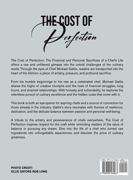 The Cost of Perfection: The Financial and Personal Sacrifices of a Chef's Life offers a raw and unfiltered glimpse into the untold challenges of the culinary world. Through the eyes of Chef Michael Gattis, readers are transported into the heart of the kitchen-a place of artistry, pressure, and profound sacrifice. From his humble beginnings to his rise as a celebrated chef, Michael Gattis shares the highs of creative triumphs and the lows of financial struggles, long hours, and strained relationships. With honesty and vulnerability, he explores the relentless pursuit of culinary excellence and the hidden costs that come with it. This book is both an eye-opener for aspiring chefs and a source of connection for those already in the industry. Gattis's story resonates with themes of resilience, dedication, and the delicate balance between passion and personal well-being.A tribute to the artistry and perseverance of chefs everywhere, The Cost of Perfection inspires respect for the craft while reminding readers of the value of balance in pursuing any dream. Dive into the life of a chef who turned raw ingredients into unforgettable experiences, and discover the price of culinary greatness.