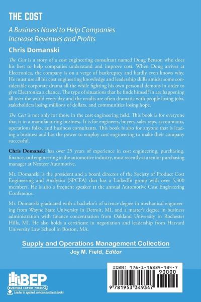 The Cost is for those in the cost engineering field and everyone who is in a manufacturing business: engineers, buyers, sales reps, accountants, operations folks, and business consultants. The Cost is a story of a cost engineering consultant named Doug Benson who does his best to help companies understand and improve cost. When Doug arrives at Electronica, the company is on a verge of bankruptcy and hardly even knows why. He must use all his cost engineering knowledge and leadership skills amidst some considerable corporate drama all the while fighting his own personal demons in order to give Electronica a chance. The type of situations that he finds himself in are happening all over the world every day and the results are often dramatic with people losing jobs, stakeholders losing millions of dollars, and communities losing hope. The Cost is not only for those in the cost engineering field. This book is for everyone in a manufacturing business. It is for engineers, buyers, sales reps, accountants, operations folks, and business consultants. This book is also for anyone that is leading a business and has the power to employ cost engineering to make their company successful.