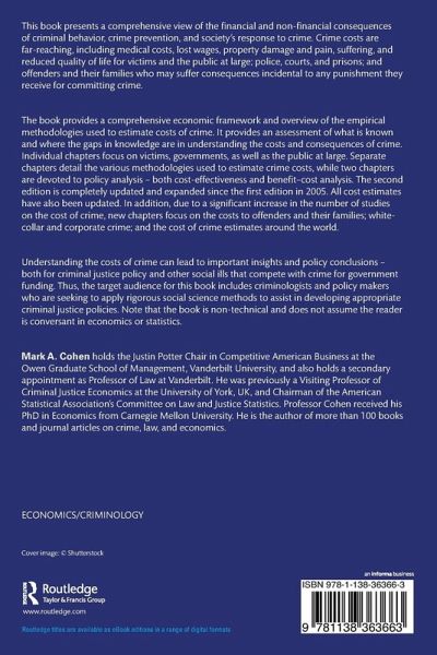The book provides a comprehensive economic framework and overview of the empirical methodologies used to estimate costs of crime. It provides an assessment of what is known and where the gaps in knowledge are in understanding the costs and consequences of crime. Individual chapters focus on victims, governments, as well as the public at large. Separate chapters detail the various methodologies used to estimate crime costs, while two chapters are devoted to policy analysis - both cost-effectiveness and benefit-cost analysis. The second edition is completely updated and expanded since the first edition in 2005. All cost estimates have also been updated. In addition, due to a significant increase in the number of studies on the cost of crime, new chapters focus on the costs to offenders and their families; white-collar and corporate crime; and the cost of crime estimates around the world.