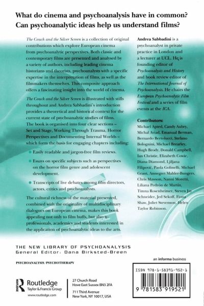 The Couch and the Silver Screen is a collection of original contributions which explore European cinema from psychoanalytic perspectives. Both classic and contemporary films are presented and analysed by a variety of authors, including leading cinema historians and theorists, psychoanalysts with a specific expertise in the interpretation of films, as well as the filmmakers themselves. This composite approach offers a fascinating insight into the world of cinema. The Couch and the Silver Screen is illustrated with stills throughout and Andrea Sabbadini's introduction provides a theoretical and historical context for the current state of psychoanalytic studies of films. The book is organised into four clear sections - Set and Stage, Working Through Trauma, Horror Perspectives and Documenting Internal Worlds - which form the basis for engaging chapters including: easily readable and jargon-free film reviews. essays on specific subjects such as perspectives on the horror film genre and adolescent development. transcripts of live debates among film directors including Bernardo Bertolucci, actors, critics and psychoanalysts discussing films. The cultural richness of the material presented, combined with the originality of multidisciplinary dialogues on European cinema, makes this book appealing not only to film buffs, but also to professionals, academics and students interested in the application of psychoanalytic ideas to the arts.