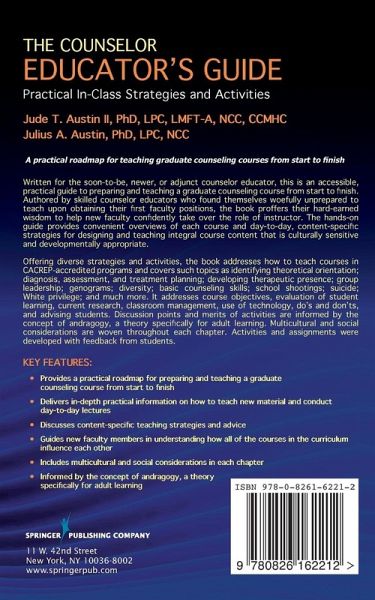Written for the soon-to-be, novice, or adjunct counselor educator, this is an accessible, practical guide to preparing and teaching a graduate counseling course from start to finish. Authored by skilled counselor educators, the book proffers their hard-earned wisdom to help new faculty confidently take over the role of instructor.