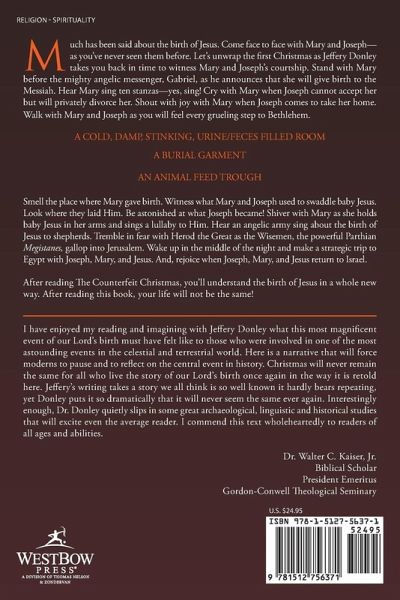 Much has been said about the birth of Jesus. Come face to face with Mary and Joseph-as you've never seen them before. Let's unwrap the first Christmas as Jeffery Donley takes you back in time to witness Mary and Joseph's courtship. Stand with Mary before the mighty angelic messenger, Gabriel, as he announces that she will give birth to the Messiah. Hear Mary sing ten stanzas-yes, sing! Cry with Mary when Joseph cannot accept her but will privately divorce her. Shout with joy with Mary when Joseph comes to take her home. Walk with Mary and Joseph as you will feel every grueling step to Bethlehem. A cold, damp, stinking, urine/feces-filled room. A burial garment. An animal feed trough. Smell the place where Mary gave birth. Witness what Mary and Joseph used to swaddle baby Jesus. Look where they laid him. Be astonished at what Joseph became! Shiver with Mary as she holds baby Jesus in her arms and sings a lullaby to him. Hear an angelic army sing about the birth of Jesus to shepherds. Tremble in fear with Herod the Great as the Wise Men, the powerful Parthian Megistanes, gallop into Jerusalem. Wake up in the middle of the night and make a strategic trip to Egypt with Joseph, Mary, and Jesus. And rejoice when Joseph, Mary, and Jesus return to Israel. After reading The Counterfeit Christmas, you'll understand the birth of Jesus in a whole new way. After reading this book, your life will not be the same! I have enjoyed my reading and imagining with Jeffery Donley what this most magnificent event of our Lord's birth must have felt like to those who were involved in one of the most astounding events in the celestial and terrestrial world. Here is a narrative that will force moderns to pause and to reflect on the central event in history. Christmas will never remain the same for all who live the story of our Lord's birth once again in the way it is retold here. Jeffery's writing takes a story we all think is so well known it hardly bears repeating, yet Donley puts it so dramatically that it will never seem the same ever again. Interestingly enough, Dr. Donley quietly slips in some great archaeological, linguistic and historical studies that will excite even the average reader. I commend this text wholeheartedly to readers of all ages and abilities. Dr. Walter C. Kaiser, Jr. Biblical Scholar President Emeritus Gordon-Conwell Theological Seminary