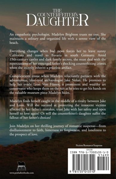 An empathetic psychologist, Madelyn Brighton trusts no one. She maintains a solitary and organized life with a serene view of the beach. Everything changes when bad news forces her to leave sunny California and travel to Bavaria in south Germany. Amid 19th-century castles and dark family secrets, she must deal with the repercussions of her estranged father's shocking counterfeiting crimes when she secretly inherits a priceless artifact. Complications ensue when Madelyn reluctantly partners with the adventurous, blue-eyed archaeologist Jake Nolan. He promises to help her evade Leon Von Füssen, a prominent and wealthy art conservator who keeps them on the run as he tries to get his hands on the valuable museum piece Madelyn hides. Madelyn finds herself caught in the middle of a rivalry between Jake and Leon. Will she succeed at protecting the innocent victims affected by her father's mistakes, trust Jake with her safety and open herself to love again? Or will the counterfeiter's daughter suffer the fallout of her father's choices? Join Madelyn on her thrilling journey of romantic suspense-from disillusionment to faith, bitterness to forgiveness, and loneliness to the prospect of love.
