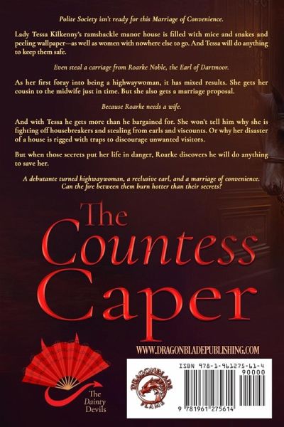 Polite Society isn't ready for this Marriage of Convenience. Lady Tessa Kilkenny's ramshackle manor house is filled with mice and snakes and peeling wallpaper-as well as women with nowhere else to go. And Tessa will do anything to keep them safe. Even steal a carriage from Roarke Noble, the Earl of Dartmoor. As her first foray into being a highwaywoman, it has mixed results. She gets her cousin to the midwife just in time. But she also gets a marriage proposal. Because Roarke needs a wife. And with Tessa he gets more than he bargained for. She won't tell him why she is fighting off housebreakers and stealing from earls and viscounts. Or why her disaster of a house is rigged with traps to discourage unwanted visitors. But when those secrets put her life in danger, Roarke discovers he will do anything to save her. A debutante turned highwaywoman, a reclusive earl, and a marriage of convenience. Can the fire between them burn hotter than their secrets? The Dainty Devils The Duchess Games The Countess Caper The Husband Heist Note: This series is part of Dragonblade's Flame line, so this is a scorching-hot read with open-door steam.