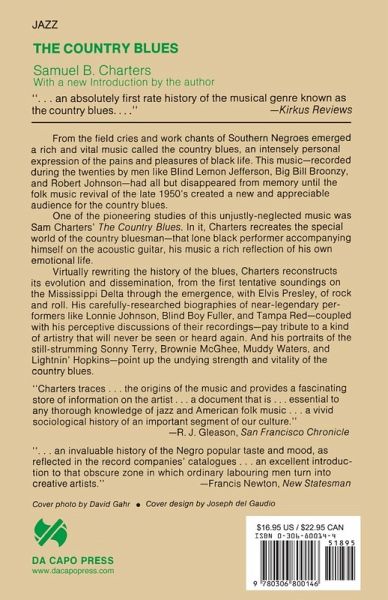 Samuel Charters is a musicographer, novelist, poet, and producer of jazz and blues records who for many years has also been seriously interested in every aspect of black music. His book, The Country Blues, was the first to be published on the subject. He began making field recordings in the South in the early 1950s and has subsequently produced many recordings, both of individual blues artists and of the musical backgrounds of the blues in the United States and the Caribbean. He has since extended his research and recording to West Africa. His other books include Jazz: A History of the New York Scene, The Blues Makers, and The Roots of the Blues.
