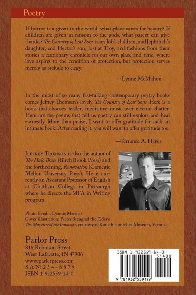 Description Jeffrey Thomson's second collection of poems, The Country of Lost Sons, investigates the narrative environment of childhood, especially the way violence is inscribed on children through myth, culture, and legend. The poems trace the growth of the author's young son (his vulnerability and equal potential for violence) across a landscape of rewritten myth and narrative. From the Trojan War (bracketed as it is by the deaths of two children, Iphegenia and Astyanax) through the Biblical accounts of Job, Jeremiah, and Jephthah to the modern tragedies of the war in Kosovo, AIDS, and the contemporary culture of violence, the poems build to a culmination of fear that is only tempered by love, grace, and the redemptive power of storytelling itself. About the Author The Country of Lost Sons is Jeffrey Thomson's third collection of poetry. His first collection of poetry was The Halo Brace (Birch Brook Press). Renovation, his third book, is forthcoming from Carnegie Mellon University Press. He has also published poetry and nonfiction in Quarterly West, New Delta Review, Puerto del Sol, Gulf Coast, and Willow Springs, as well as critical essays on Sandra Cisneros, James Wright, Derek Walcott and the environmental elegy. He has been a Fellow at the Writers @ Work Conference and a Tennessee Williams Scholar at the Sewanee Writers Conference. His works have won numerous awards, including the Master's Poetry Contest and the Academy of American Poets' Prize on three occasions. He received his PhD from the University of Missouri in Creative Writing in 1996 and is currently an Assistant Professor of English at Chatham College in Pittsburgh where he directs the MFA in Writing program.