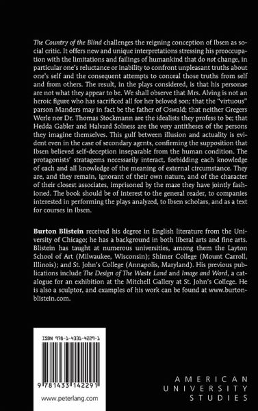 The Country of the Blind challenges the reigning conception of Ibsen as social critic. It offers new and unique interpretations stressing his preoccupation with the limitations and failings of humankind that do not change, in particular one's reluctance or inability to confront unpleasant truths about one's self and the consequent attempts to conceal those truths from self and from others. The result, in the plays considered, is that his personae are not what they appear to be. We shall observe that Mrs. Alving is not an heroic figure who has sacrificed all for her beloved son; that the "virtuous" parson Manders may in fact be the father of Oswald; that neither Gregers Werle nor Dr. Thomas Stockmann are the idealists they profess to be; that Hedda Gabler and Halvard Solness are the very antitheses of the persons they imagine themselves. This gulf between illusion and actuality is evident even in the case of secondary agents, confirming the supposition that Ibsen believed self-deception inseparable from the human condition. The protagonists' stratagems necessarily interact, forbidding each knowledge of each and all knowledge of the meaning of external circumstance. They are, and they remain, ignorant of their own nature, and of the character of their closest associates, imprisoned by the maze they have jointly fashioned. The book should be of interest to the general reader, to companies interested in performing the plays analyzed, to Ibsen scholars, and as a text for courses in Ibsen.