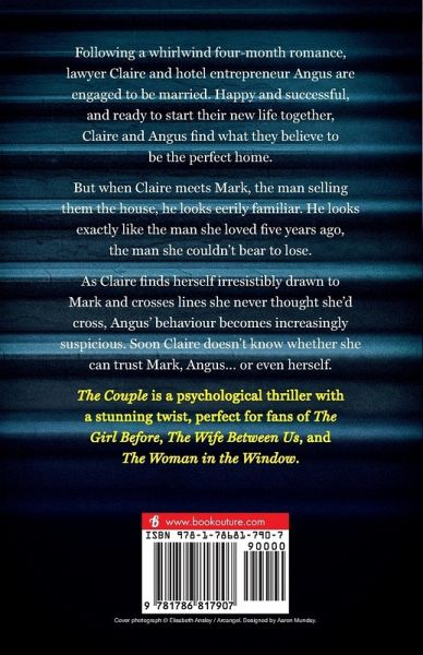 Whatever you think you know… you're wrong. Following a whirlwind four-month romance, lawyer Claire and hotel entrepreneur Angus are engaged to be married. Happy and successful, and ready to start their new life together, Claire and Angus find what they believe to be the perfect home. But when Claire meets Mark, the man selling them the house, he looks eerily familiar. He looks exactly like the man she loved five years ago, the man she couldn't bear to lose. As Claire finds herself irresistibly drawn to Mark and crosses lines she never thought she'd cross, Angus' behaviour becomes increasingly suspicious. Soon Claire doesn't know whether she can trust Mark, Angus… or even herself. The Couple is a psychological thriller with a stunning twist, perfect for fans of The Girl Before, The Wife Between Us, and The Woman in the Window. Readers love The Couple: 'A fiendishly smart psychological thriller, and I simply devoured it in a single day.' Goodreads Reviewer, 5 stars 'I haven't read a book with such an awesome "GOTCHA" moment in a long, long time. Brilliant!' KayCKay Book Reviews, 5 stars 'I started this book on a Sunday morning and my family didn't see me again until Sunday night! This book is a very fast read that had me hanging on the entire time… Just a brilliant read!' Goodreads Reviewer, 5 stars