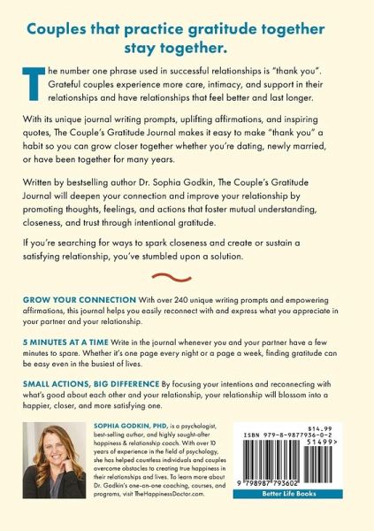 Couples that practice gratitude together stay together. The number one phrase used in successful relationships is "thank you". Grateful couples experience more care, intimacy, and support in their relationships and have relationships that feel better and last longer. With its unique journal writing prompts, uplifting affirmations, and inspiring quotes, The Couple's Gratitude Journal makes it easy to make "thank you" a habit so you can grow closer together whether you're dating, newly married, or have been together for many years. Written by bestselling author Dr. Sophia Godkin, The Couple's Gratitude Journal will deepen your connection and improve your relationship by promoting thoughts, feelings, and actions that foster mutual understanding, closeness, and trust through intentional gratitude. If you're searching for ways to spark closeness and create or sustain a satisfying relationship, you've stumbled upon a solution. ¿ GROW YOUR CONNECTION With over 240 unique writing prompts and empowering affirmations, this journal helps you easily reconnect with and express what you appreciate in your partner and your relationship. ¿ 5 MINUTES AT A TIME Write in the journal whenever you and your partner have a few minutes to spare. Whether it's one page every night or a page a week, finding gratitude can be easy even in the busiest of lives. ¿ SMALL ACTIONS, BIG DIFFERENCE By focusing your intentions and reconnecting with what's good about each other and your relationship, your relationship will blossom into a happier, closer, and more satisfying one.