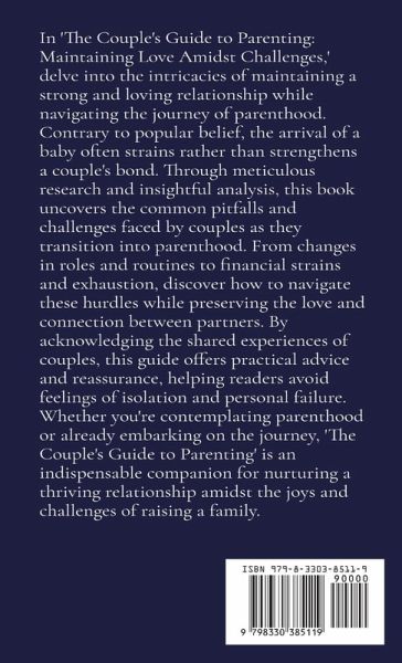 In 'The Couple's Guide to Parenting: Maintaining Love Amidst Challenges,' delve into the intricacies of maintaining a strong and loving relationship while navigating the journey of parenthood. Contrary to popular belief, the arrival of a baby often strains rather than strengthens a couple's bond. Through meticulous research and insightful analysis, this book uncovers the common pitfalls and challenges faced by couples as they transition into parenthood. From changes in roles and routines to financial strains and exhaustion, discover how to navigate these hurdles while preserving the love and connection between partners. By acknowledging the shared experiences of couples, this guide offers practical advice and reassurance, helping readers avoid feelings of isolation and personal failure. Whether you're contemplating parenthood or already embarking on the journey, 'The Couple's Guide to Parenting' is an indispensable companion for nurturing a thriving relationship amidst the joys and challenges of raising a family.