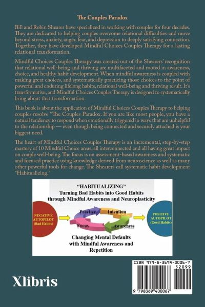 Bill and Robin Shearer have specialized in working with couples for four decades. They are dedicated to helping couples overcome relational difficulties and move beyond stress, anxiety, anger, fear, and depression to deeply satisfying connection. Together, they have developed Mindful Choices Couples Therapy for a lasting relational transformation. Mindful Choices Couples Therapy was created out of the Shearers' recognition that relational well-being and thriving are multifaceted and rooted in awareness, choice, and healthy habit development. When mindful awareness is coupled with making great choices, and systematically practicing those choices to the point of powerful and enduring lifelong habits, relational well-being and thriving result. It's transformative, and Mindful Choices Couples Therapy is designed to systematically bring about that transformation. This book is about the application of Mindful Choices Couples Therapy to helping couples resolve "The Couples Paradox. If you are like most people, you have a natural tendency to respond when emotionally triggered in ways that are unhelpful to the relationship - even though being connected and securely attached is your biggest need. The heart of Mindful Choices Couples Therapy is an incremental, step-by-step mastery of 10 Mindful Choice areas, all interconnected and all having great impact on couple well-being. The focus is on assessment-based awareness and systematic and focused practice using knowledge derived from neuroscience as well as many other powerful tools for change. We call our systematic habit development "Habitualizing." For the past 10 years, the Shearers have used Mindful Choices Couples Therapy with hundreds of couples. The results far exceed anything they and their clients experienced when the focus was on merely reducing conflict and relational stress utilizing traditional approaches.