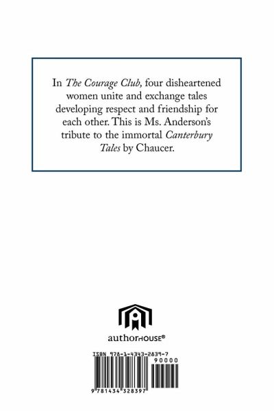 'The Courage Club' was partially inspired by the immortal Chaucer's 'Canterbury Tales.' In Ms.Anderson's latest book, four dispirited women from different walks of life decide to meet and form a club. During their discussions, they determine it is best to not have a specific purpose and instead opt to relate tales about themselves and people they have encountered. Some tales earn laughs while other stories are more profound, and during the course of their meetings, sister bonds are formed and each changes and grows as they all realize acceptance takes courage to tell strangers life triumphs and defeats and in the process bare one's soul to each other.