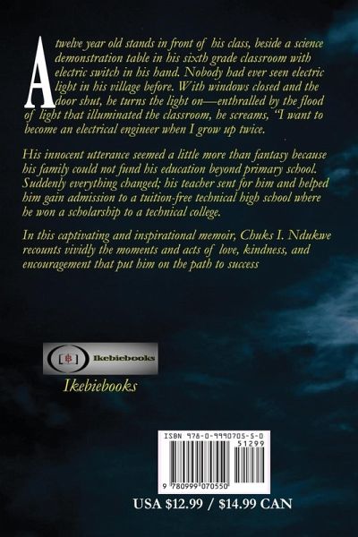 A twelve year old stands in front of his sixth grade classroom, beside a science demonstration table with electric switch in his hand. Nobody had ever seen electric light in his village before. With windows closed and the door shut, he turns the light on-enthralled by the flood of light that illuminated the classroom, he screams, "I want to become an electric engineer when I grow up." In this inspirational and captivating memoir, Chuks I. Ndukwe recounts vividly the moments and acts of love, kindness, and encouragement that put him on the path to success.