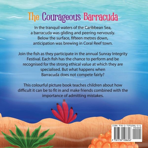In the tranquil waters of the Caribbean Sea, a barracuda was gliding and peering nervously. Below the surface, fifteen metres down, anticipation was brewing in Coral Reef town. Join the fish as they participate in the annual Sunray Integrity Festival. Each fish has the chance to perform and be recognised for the strong ethical value at which they are specialised. But what happens when Barracuda does not compete fairly? This colourful picture book teaches children about how difficult it can be to fit in and make friends combined with the importance of admitting mistakes.