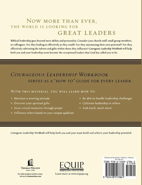 Courageous Leadership Workbook will help both you and your leadership team become the exceptional leaders that God has called you to be. Now more than ever, the world is looking for great leaders. Biblical leadership goes beyond mere ability and personality. Consider your church staff, small group members, or colleagues: Are they leading as effectively as they could? Are they maximizing their own potential? Are they effectively cultivating the talents and gifts within those they influence? The Courageous Leadership Workbook serves as a "how to" guide for every leader.